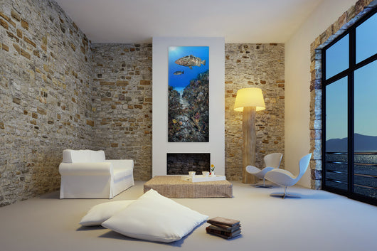 “Coral Anchors” is a 2,330 Megapixel image of a coral reef wall off Cayman Brac, densely populated with colorful marine life. The seamless mosaic image was composited from over 2500 high resolution digital images photographed at close range with a custom camera platform and lighting system. A year-long project to create the image took place in several phases, starting with scouting sites around the island. Once the site was chosen, the initial photography took place over several weeks in Summer 2015. Post-production took seven weeks to complete, along with the design of the display graphics and frame.